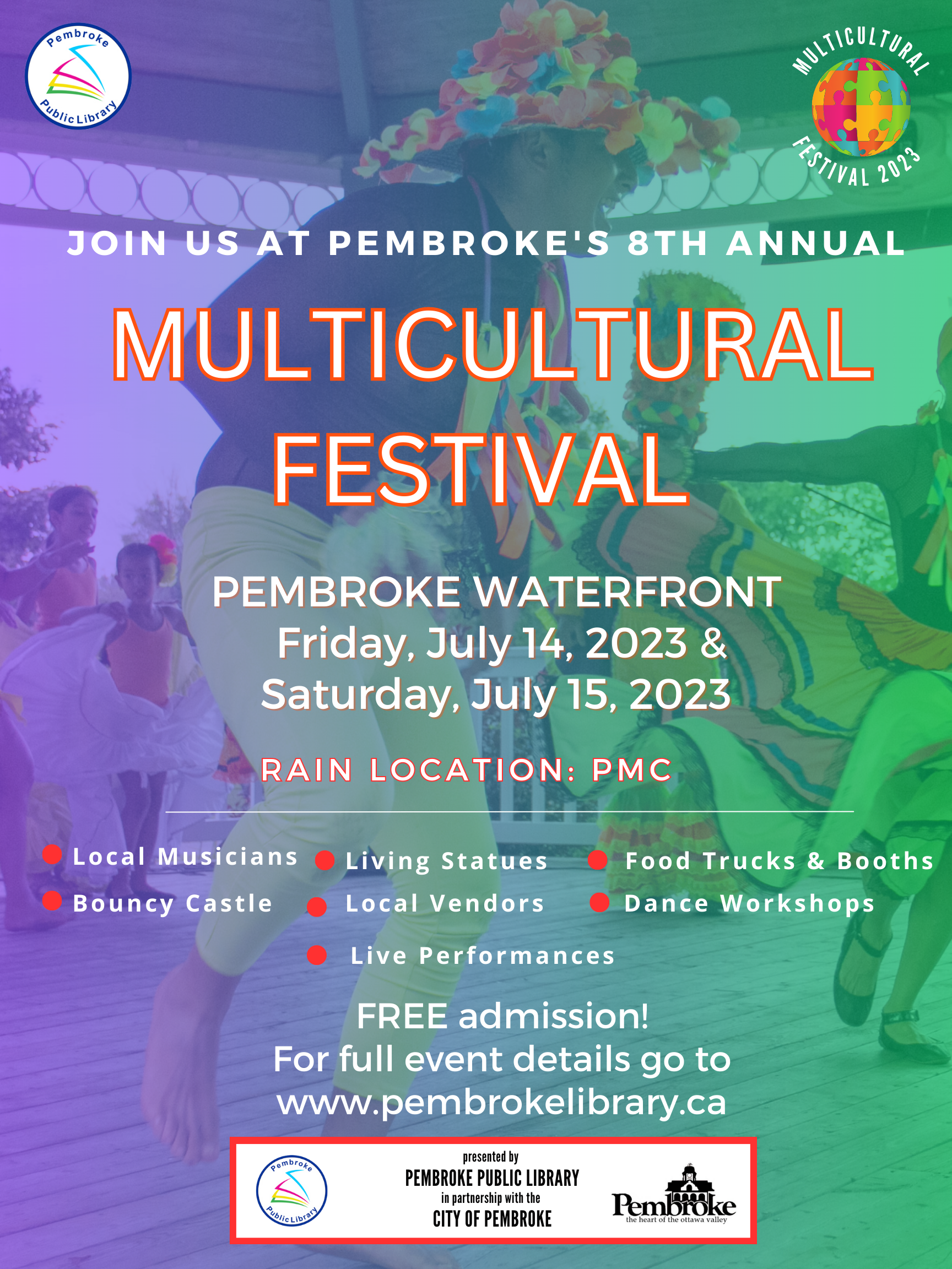 Pembroke Public Library presents the 8th annual Multicultural Festival in partnership with the City of Pembroke. This year's festival will contain a variety of elements such as local vendors, live performances, Food Trucks & Booths, Dance workshops, Bouncy Castle & More!