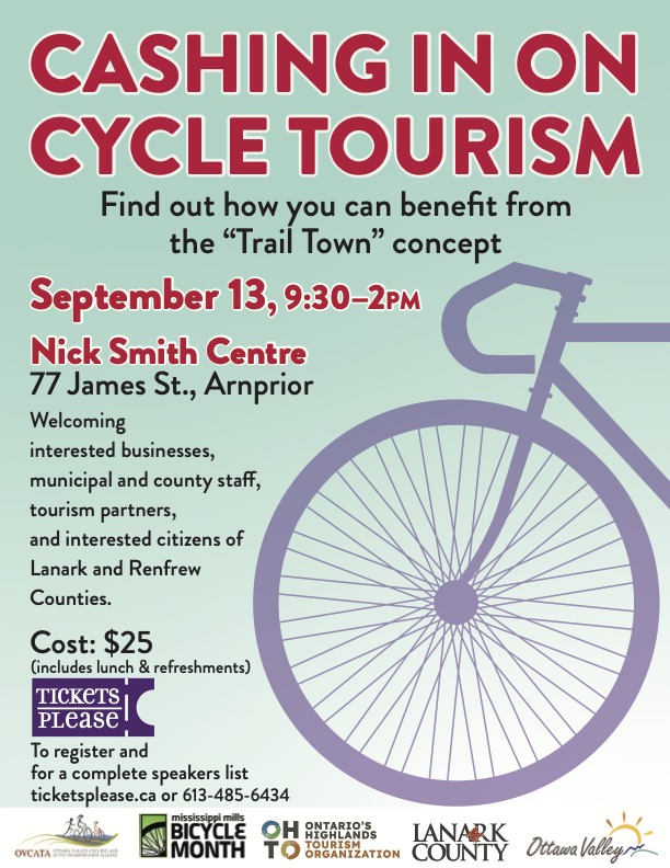On Wednesday, September 13, the group will host a meeting at the Nick Smith Centre in Arnprior from 9:30am to 2pm to discuss the potential of the "Trail Town" concept for cycle tourism. Louisa Mursell of Ontario by Bike, Jennifer McCourt of Discovery Routes/Voyageur Trail, Brenda Wood for Trent-Severn Trail Towns and Bob Peltzer of OVCATA will all present.