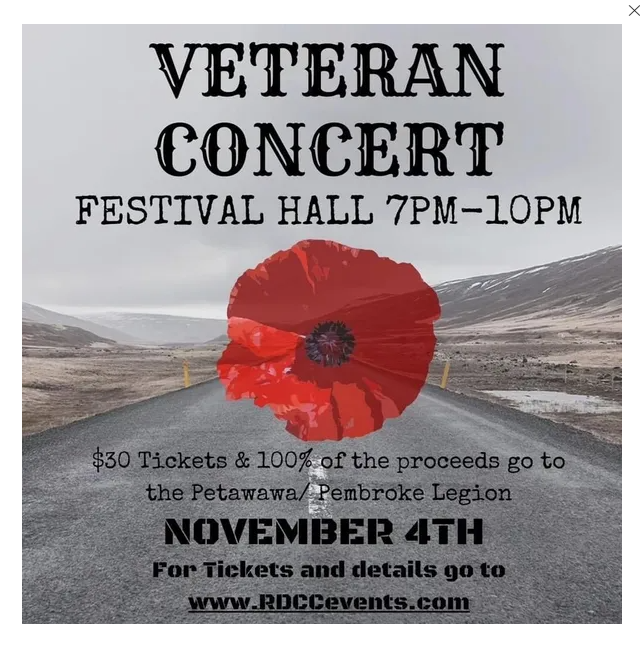 Join us for an unforgettable evening of music and tribute to our brave veterans! The Veteran Concert will be held at the Festival Hall Centre for the Arts, located on Isabella Street in Pembroke, Ontario, Canada. Get ready to be moved by powerful performances from talented veteran musicians as we honor those who have served our country. Each musical act includes veterans or a serving members of our Armed Forces. Immerse yourself in music and videos of veteran stories. Musical performances by JJ Staley Music, Jennifer Gagnon, Music Healing Veterans and Stereo Typical. 100% of all the proceeds will go to the Pembroke and Petawawa Legions. For more details visit www.RDCCevents.com