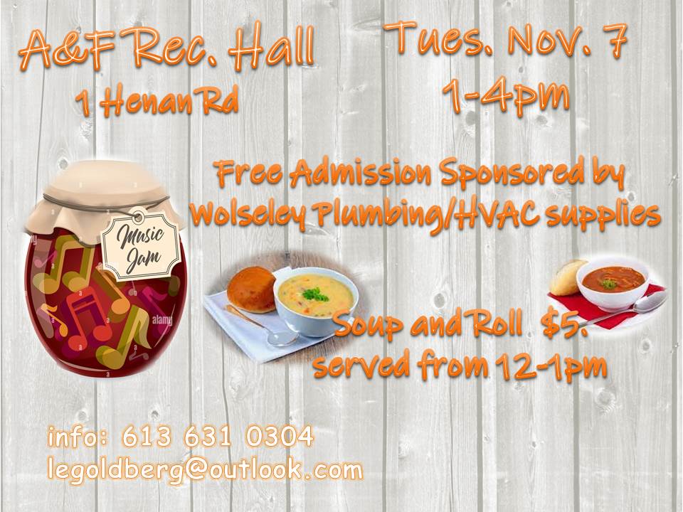Join us for a Music Jam Session at the A+F Recreation Centre on November 7th from 1:00 pm to 4:00 pm.