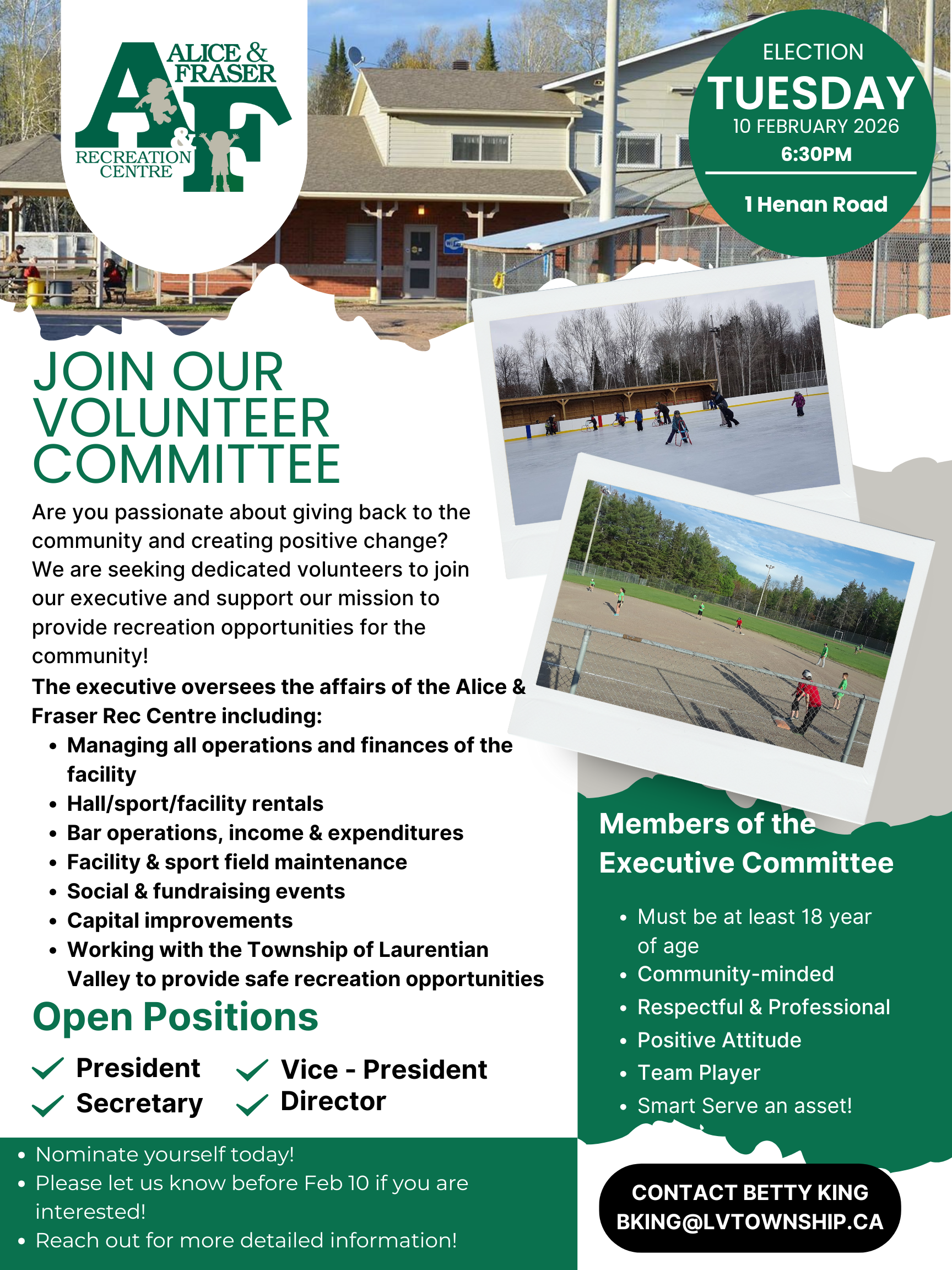 The Alice & Fraser Recreation Association is seeking dedicated volunteers, age 18 and over, to join our executive team. Help manage the operations of the recreation facility and support recreation programs that bring our community together. Elections will be held February 10th at 6:30 p.m. at the Alice & Fraser Recreation Centre. Get involved and help keep recreation thriving in Laurentian Valley!