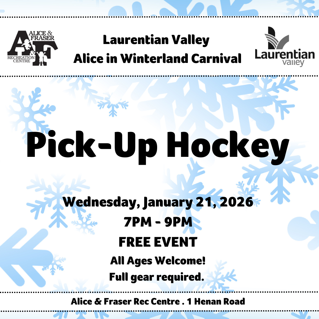 The 2026 Laurentian Valley Alice in Winterland Carnival is a fun week long event that runs from January 16 - 23, 2026. Come out for some fun excercise and fresh air with the Carnival's Pick up Hockey Night!