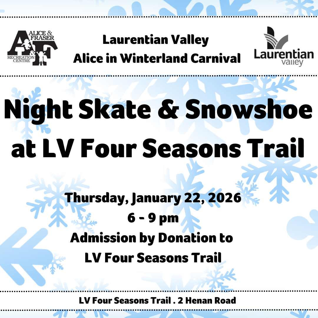 The 2026 Laurentian Valley Alice in Winterland Carnival is a fun week long event that runs from January 16 - 23, 2026. If you haven't had the opportunity to skate or snowshoe the majestic LV Four Seasons Trail here is your opportunity!